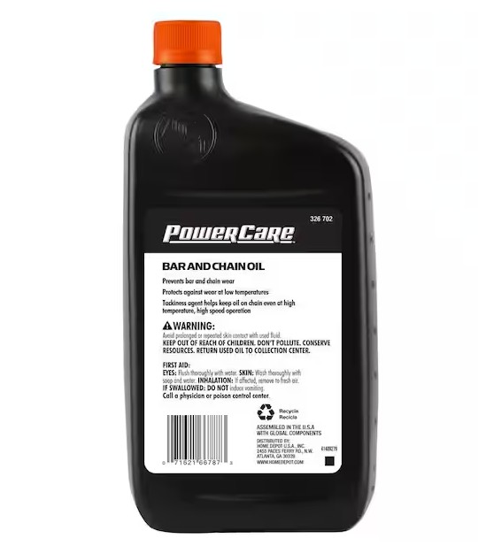 Power Care 1 qt. Bar and Chain Oil is specially formulated to provide superior protection and performance. For use in chain saws and other chain-driven equipment. Tackiness agent helps keep the oil on the chain even at high temperature and/or high speed operation.