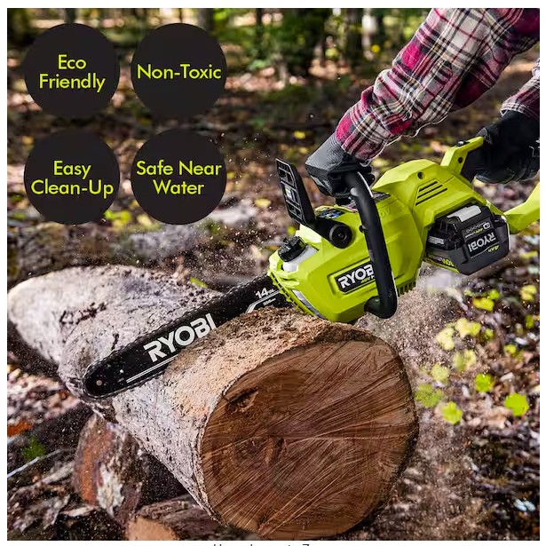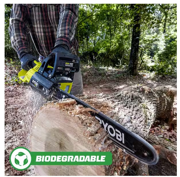 Eco Friendly; Made From Plant-Based, Biodegradable Materials No Staining of Clothes or Pavement Works With All Chainsaws About This Product The RYOBI Biodegradable Bar & Chain Lubricant allows you to work clean & toxin free. This environmentally friendly lubricant is made from plant-based, biodegradable materials. It contains no petroleum for safe use in all environments.…