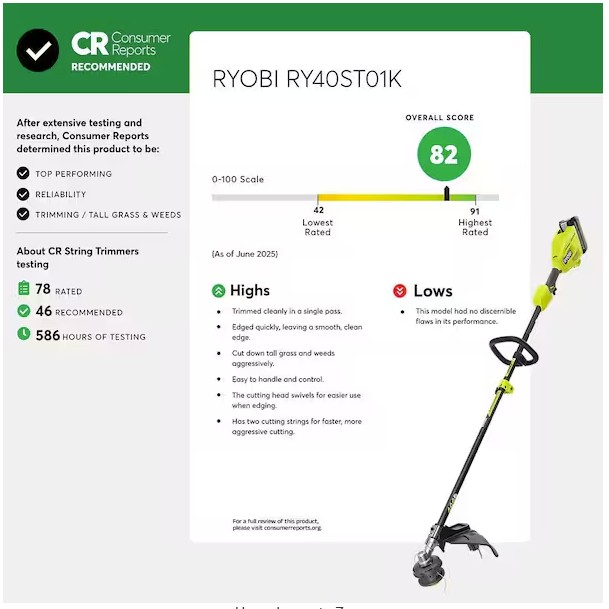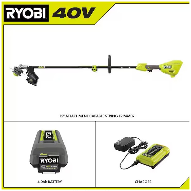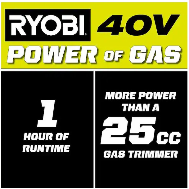 The 40V 15″ String Trimmer Kit delivers more power than a 25cc gas string trimmer, making it a true gas replacement without the hassle of gas. With just the pull of a trigger, trim for 1 hour using a 40V 4Ah battery. Save money, time, and space with attachment capability and transform your string trimmer into a variety of tools. This trimmer is compatible with RYOBI EXPAND-IT attachments & other universal attachments to take on any job around the yard. Trim weeds & grass with the adjustable 13″ to 15″ cut swath. A larger cut swath will give you maximum performance while a smaller cut swath gives you maximum runtime. This trimmer is equipped with a variable speed trigger to achieve maximum control when trimming along fences, mailboxes, and flower beds. Conveniently reload your .080″ line in under 60 seconds with the REEL EASY+ SPEED WINDER bump feed head. Best of all, it is part of the RYOBI 40V system where any 40V battery works with any 40V product. This 40V 15″ String Trimmer Kit is backed by the RYOBI 5-Year Manufacturer’s Tool Warranty, 3-Year Manufacturer’s Battery Warranty, and includes RY40PH01 40V Power Head, A54ST01 Straight Shaft Trimmer Attachment, OP40404 40V 4Ah Battery, OP404 40V Charger, Front Handle, Grass Deflector, .080″ Replacement Line, and Operator’s Manuals.