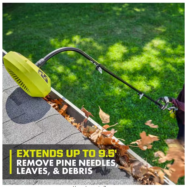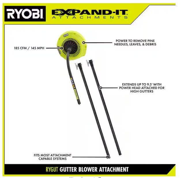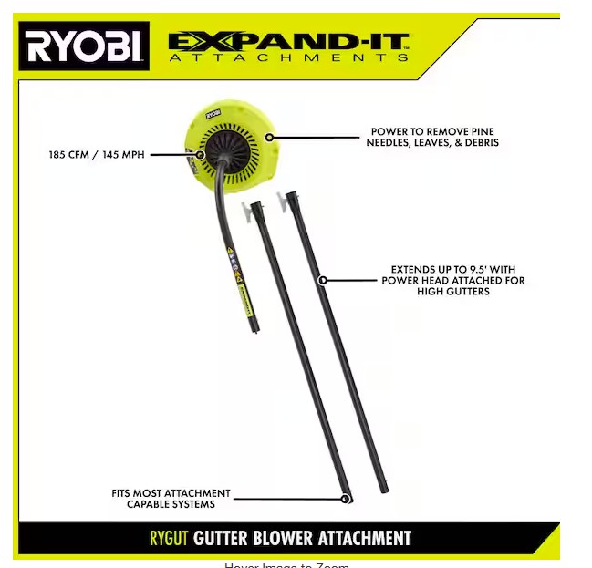 Expand your RYOBI system with the RYOBI EXPAND-IT Gutter Blower Attachment. As part of the RYOBI EXPAND-IT Attachment System, easily transform your attachment capable string trimmer into a gutter blower saving money, time, and space. This gutter blower is ideal for removing pine needles, leaves, and debris with 185 CFM of clearing power. Extending up to 9.5′ with the power head attached, you can easily clean out your high gutters. The RYOBI EXPAND-IT Gutter Blower Attachment is compatible with most gas & cordless attachment capable systems. It’s backed by the RYOBI 3-Year Manufacturer’s Warranty and includes RYGUT Gutter Blower Attachment, (2) Extension Shafts, and Operator’s Manual.