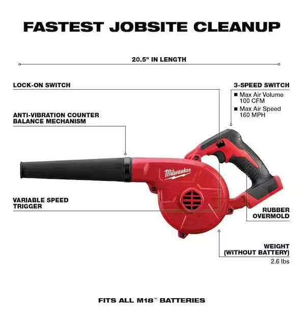 The M18 Compact Cordless Blower delivers fast job-site cleanup with a best-in-class power-to-size ratio. It is controlled by way of a 3-speed electronic switch, lock-on feature and a variable-speed trigger which allows for versatile clearing power. This blower moves air at 160 MPH and 100 CFM for class-leading performance. Featuring a shock-absorbing polymer body and a crush-resistant nozzle, the M18 Compact Blower delivers job-site durability. Included is a 9 in. extension nozzle to clear dust and debris easily from the ground or overhead. It is compatible with any M18 Milwaukee battery (sold separately) and the tool is protected by a 5-year limited warranty.