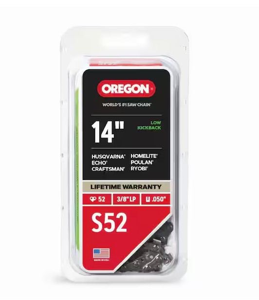 S52 replacement chainsaw chain for 14 in. bar Fits, Echo, Craftsman, Poulan, Homelite, Makita Husqvarna Sharp non-chisel cutters allow for smooth and effortless cut7 About This Product The Oregon S52 AdvanceCut Saw Chain is for homeowners and occasional users who want a low-vibration and low-kickback saw chain. The Chamfer Chisel cutters’ twin cutting corners offer…
